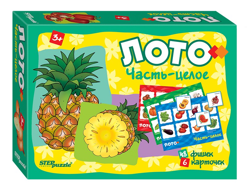 Лото «Часть-целое» знакомит с овощами, фруктами и ягодами. Учит находить целый предмет по его частям.