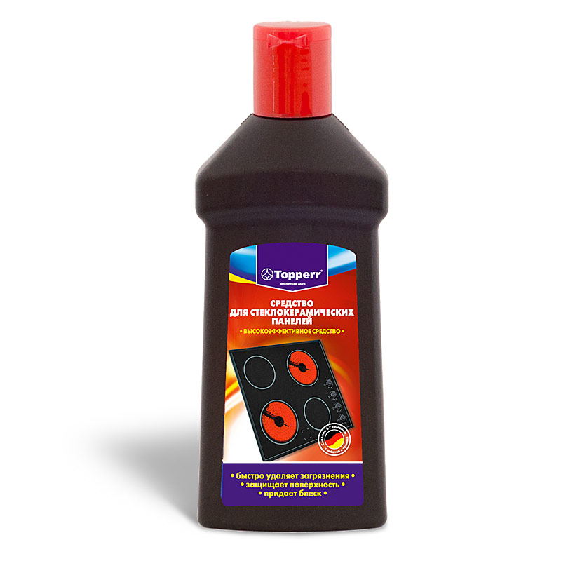 Средство для ухода за стеклокерамическими и индукционными плитами предназначено для быстрого удаления любых загрязнений со стеклокерамических поверхностей, защищает поверхность, придаёт блеск, облегчает последующий уход, продлевает срок службы Вашей плиты. Благодаря входящему в состав силикону идеально очищает не царапая, оставляет на поверхности защитный слой и глянец. Одобрено к использованию компанией SCH*OTT, крупнейшим производителем стеклокерамики торговой марки CER*AN.