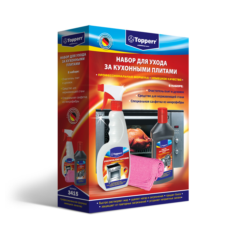 Набор предназначен для эффективного и бережного ухода за кухонной плитой. Используя данный набор, Вы легко справитесь с жировыми и любыми другими загрязнениями, сохраните первоначальную чистоту поверхностей.