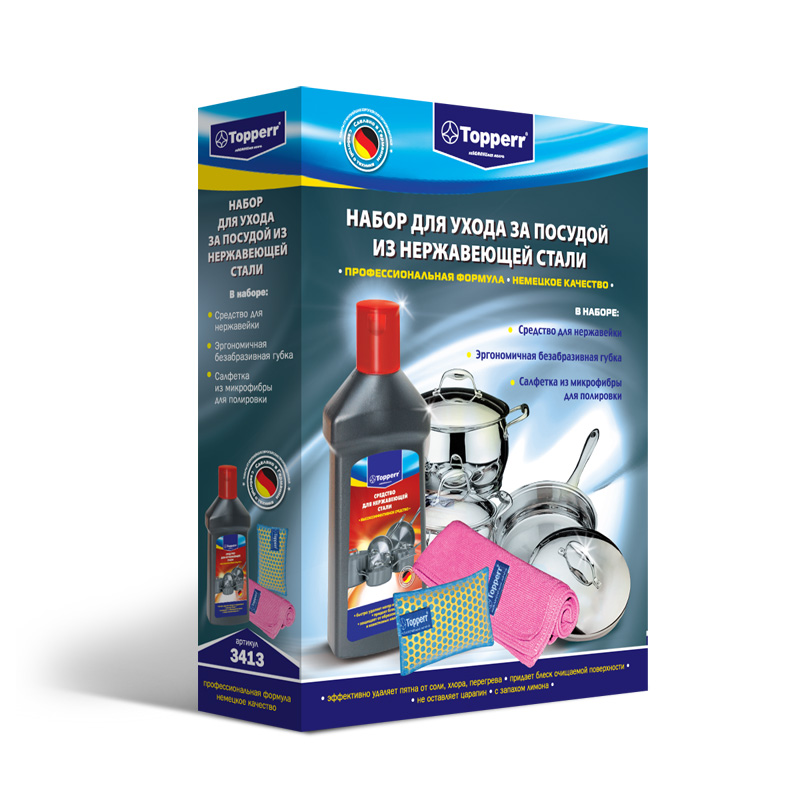Набор для чистки и ухода за посудой из нержавеющей стали.