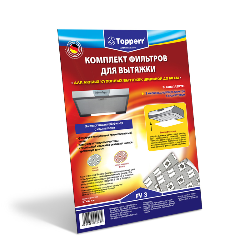 - два жиропоглощающих фильтра размером 47 см*55 см с индикатором Topperr, как только индикатор изменит свой цвет с серого на красный – произведите замену фильтра.