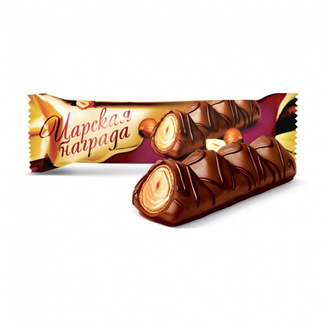 Великолепная линейка конфет ТМ «Царская награда»; находит свое продолжение в батончике. Продукт порадует сочетанием вафель с нежной молочной начинкой и целым фундуком, покрытых молочно-шоколадной глазурью